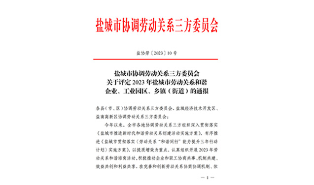 近日,鹽城市協調勞動關系三方委員會按照《關于開展 2023 年勞動關系和諧培育活動的通知》的工作部署,經各地協調勞動關系三方委員會培育、驗收、推薦,市協調勞動關系三方委員會研究決定,評定鹽城市灌東經濟開發投資有限公司為 2023 年鹽城市勞動關系和諧企業之一。2024-01-08 -
